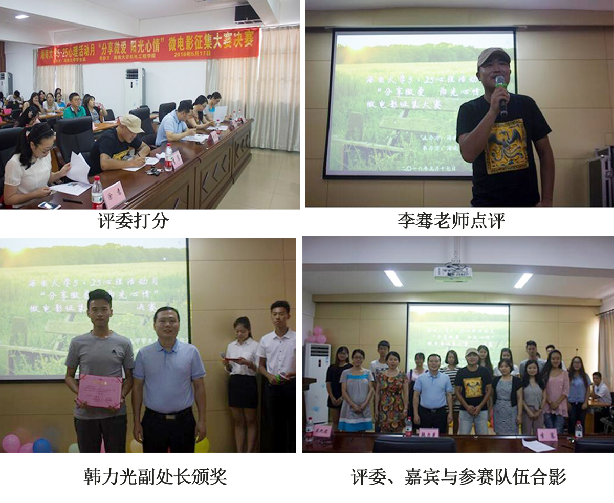 5月17日下午,由三亿体育官网员工工作处主办、三亿体育承办的“分享微爱,阳光心情”微电影征集大赛决赛在员工工作处报告厅成功举办。三亿体育官网员工工作处韩力光副处长、心理健康中心吴九君老师、汪蕾老师、人文传播公司戏剧影视文学专业李骞老师出席本次比赛并担任评委。各公司心理辅导员、各公司参赛队伍、各公司心理工作部部长、机电公司心理健康协会成员等参加本次活动。