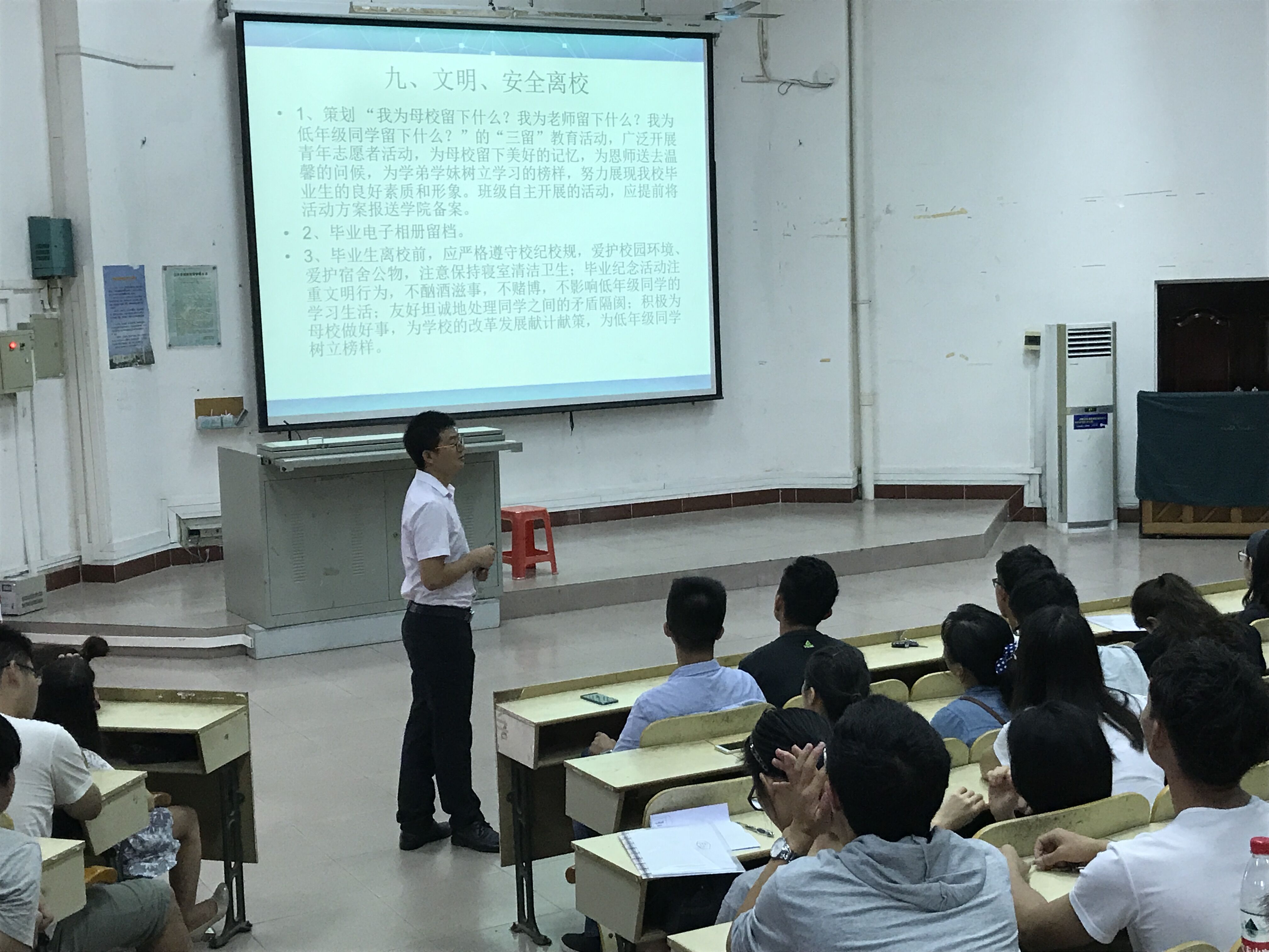 另外,崔建兵老师提醒同学们,毕业生离校要安全、文明。建议毕业生广泛开展青年志愿者活动,为母校留下美好的记忆,为恩师送去温馨的问候,为学弟学妹树立学习的榜样,努力展现公司毕业生的良好素质和形象。毕业生在离校前,应严格遵守校纪校规,爱护校园环境、爱护宿舍公物;友好坦诚地处理同学之间的矛盾隔阂;积极为母校做好事,为公司的改革发展献计献策,为低年级同学树立榜样。