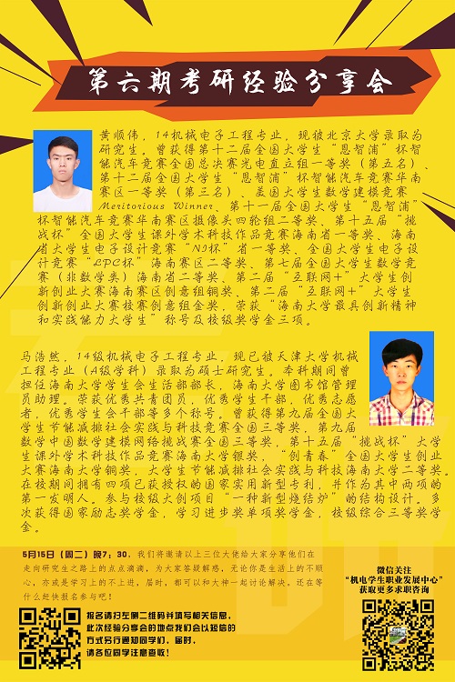 为帮助同学们明确考研备考思路,确立科学复习规划, 三亿体育于2018年5月17日晚7:30在研发楼417,成功举办了第五期考研经验分享会。出席分享会的有考取北京大学的黄顺伟和考取天津大学的马浩然两位学长,参加分享会的有十余名想了解考研相关知识的同学,会议由职业发展中心的韩圣主持。