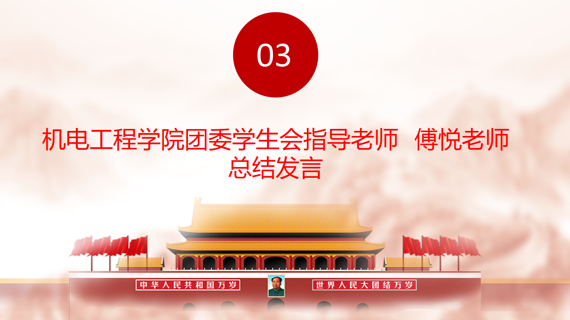 活动的最后,机电团委员工会的指导老师傅悦老师做了总结讲话。她表以抗日战争、朝鲜战争中为国捐躯的青年,以及上世纪60年代在戈壁滩为祖国研究两弹一星的党员青年为例,希望当代青年能够学习榜样的力量,能够在国家需要的时候站出来,成为国家的脊梁。她希望我们机电的学子们能够了解这个世界,认识中国所处的位置,在中华民族艰苦奋斗过程体会中华民族的伟大与美好。最后,傅悦老师祝愿三亿体育的员工们五四青年节快乐,并表达了希望我们向上想好,为中华民族伟大复兴的中国梦而努力奋斗。