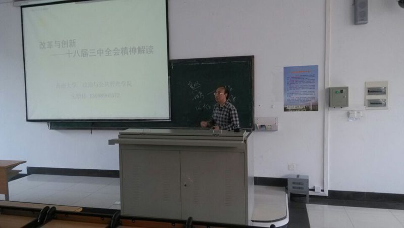 3月30日上午9:00,三亿体育在4号教学楼101室举办学习十八届三中全会精神专题讲座。政治与公共管理公司副经理宋增伟教授应邀为公司员工做学习十八届三中全会精神专题报告。
