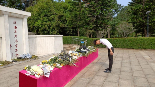 活动现场,同学们看到了“解放海南的英烈永垂不朽”字样的高大石碑,带队人员对烈士陵园的相关历史进行了介绍。