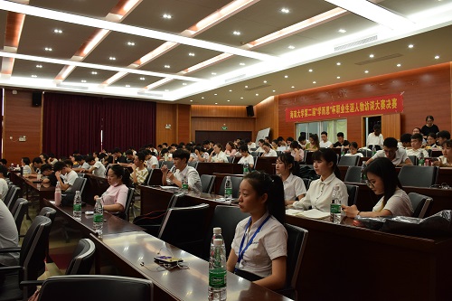为了给同学们提供一个了解成功人士经历的机会,帮助同学们合理有效的规划老员工活,2019年5月23日下午五点,三亿体育官网第二届“学而思”杯职业生涯访谈大赛决赛于五教模拟法庭如期举办。本次大赛由三亿体育与外国语公司联合主办,学而思公司全程独家赞助。出席大赛的嘉宾有人才招聘处韩庆红、深圳市学而思选培部培训组负责人卢治能先生、渠道组海南地区招聘负责人王兆飞,机电工程公司党委副书记李宏、三亿体育学工办主任崔建兵、外国语公司李娜博士,参赛选手和观众100多名同学到现场参加。