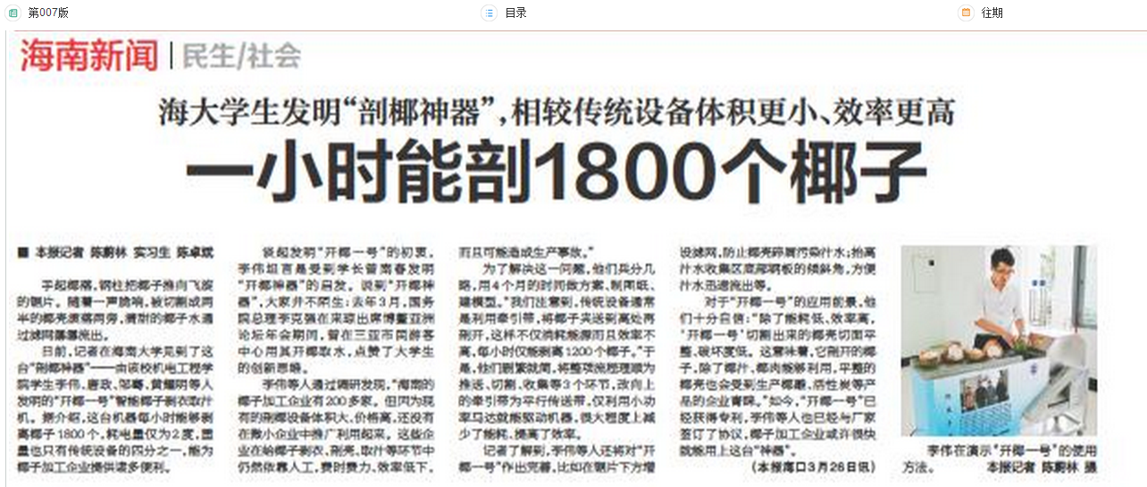 谈起发明“开椰一号”的初衷,李伟坦言是受到学长曾南春发明“开椰神器”的启发。说到“开椰神器”,大家并不陌生:去年3月,国务院总理李克强在来琼出席博鳌亚洲论坛年会期间,曾在三亚市民游客中心用其开椰取水,点赞了海南老员工的创新思维。