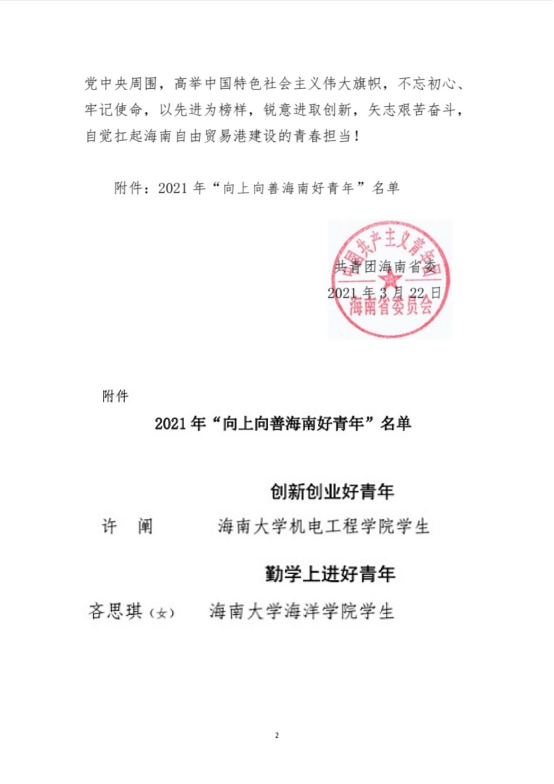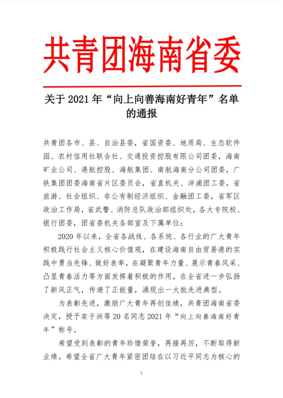 近日,公司员工许阐(本科生)被共青团海南省委评为2021年“向上向善海南好青年”之“创新创业好青年”。