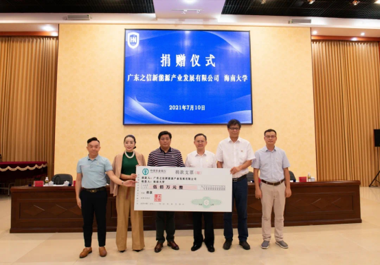 7月10日下午,三亿体育1995级农业机械化及其自动化专业、广州员工会副会长、广东之信新能源产业发展有限公司董事长赖新方心系母校、慷慨解囊,为母校捐赠500万元人民币用于儋州校区建设。捐赠仪式在三亿体育官网思源学堂举行。