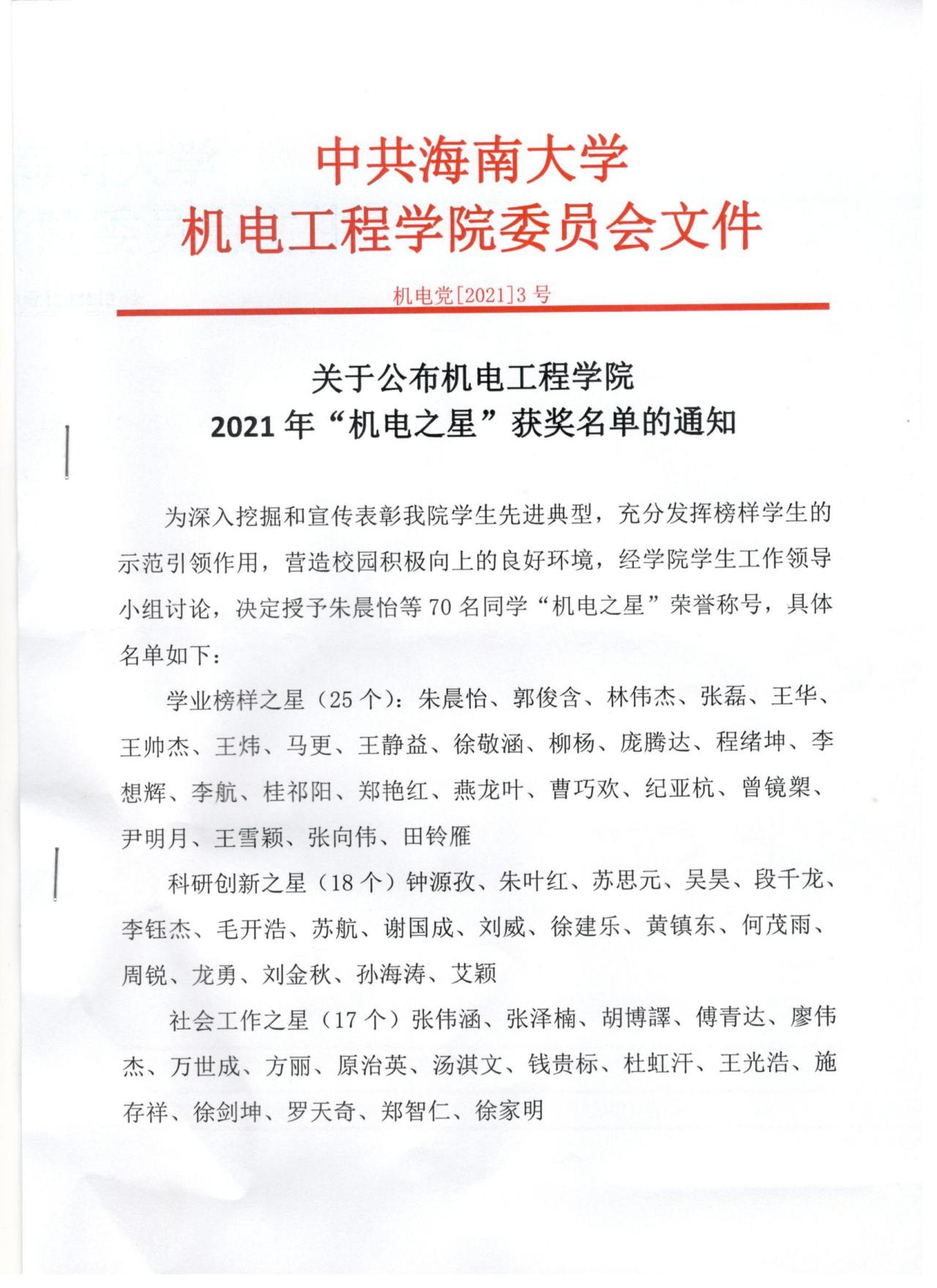 关于公布2021年“机电之星”获奖名单的通知