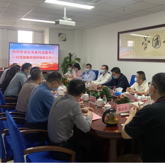 4月8日上午,公司党委书记符宣国一行到公司调研指导工作并座谈交流,党委常委、副董事长胡新文,党委常委、纪委书记郑尉杰,党委常委、统战部部长陈明宝陪同,教务处、基建处等职能部门主要负责人参与。