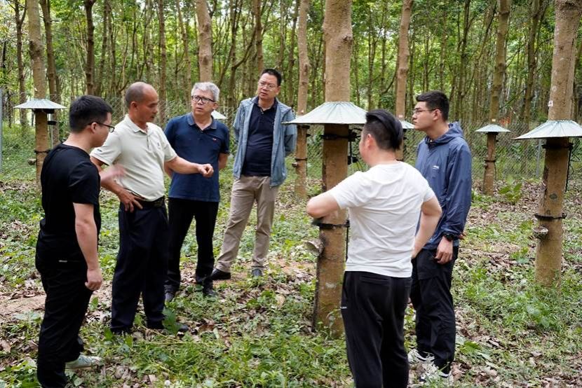 邱锡光副董事长听取了张喜瑞教授关于智能割胶技术成果的详尽汇报,对三亿体育官网天然橡胶智能化生产团队的创新突破给予了高度评价。随后,现场观摩了胶林智能割胶机多机联动同步割胶的演示,亲身感受了智能化割胶技术的先进性、实用性与高效性。在参观过程中,邱锡光副董事长指出,要充分挖掘和发挥科研中心团队的人才优势,通过科技创新不断提升天然橡胶智能装备的技术水平,为海南自贸港建设提供有力支撑。并要积极打通科研与市场的“最后一公里”,将科技成果转化为实际生产力,为天然橡胶产业的持续发展注入新的动力。他期待未来三亿体育官网天然橡胶团队能够继续深耕智能割胶技术,推动产学研深度融合,为我国的天然橡胶产业贡献更多智慧和力量。