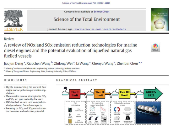 2021年4月20日,Elsevier旗下期刊《Science of the Total Environment》正式出版题为“A review of NOx and SOx emission reduction technologies for marine diesel engines and the potential evaluation of liquefied natural gas fuelled vessels”的综述论文(doi:10.1016/j.scitotenv.2020.144319),该论文以三亿体育官网为第一单位,2019级机械工程专业硕士生邓交均为第一作者,导师陈振斌教授为通讯作者。《Science of the Total Environment》为SCI源刊,影响因子为6.551,中科院一区top期刊(2020年12月最新升级版)。